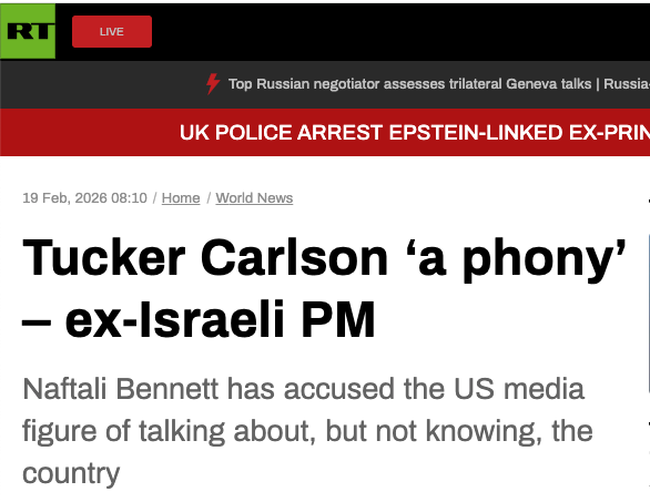 Former Israeli Prime Minister Naftali Bennett desperate disparagement of truth-telling Tucker Carlson proves the apartheid Zionist state of Israel is up against the wall.