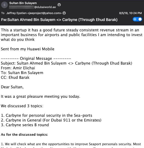 Sulayem forwarded an email from Elichai, a veteran of Israel’s Unit 8200 signals intelligence unit, proposing Sulayem’s participation in Carbyne’s Series B fundraising round that year. After meeting with Epstein and Barak, Peter Thiel had also invested in the round. Epstein introduced Barak and Elichai to one of Thiel’s venture funds while helping Barak develop relations with senior security officials in Mongolia. (Those talks had blossomed into a formal security agreement between Israel and Mongolia in 2017, which included plans for integrating Carbyne into the Mongolian emergency service.)