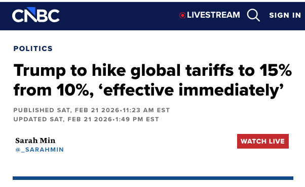 - President Donald Trump on Saturday said he would increase global tariffs to 15% from 10%, one day after the Supreme Court struck down his “reciprocal” tariffs.