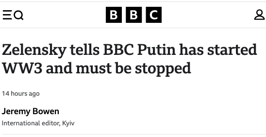 BBC propagandists and liars always have it inverted: Khazarian-directed war criminal and genocidal maniac Volodymyr Zelensky hellbent of starting a full-blown World War III