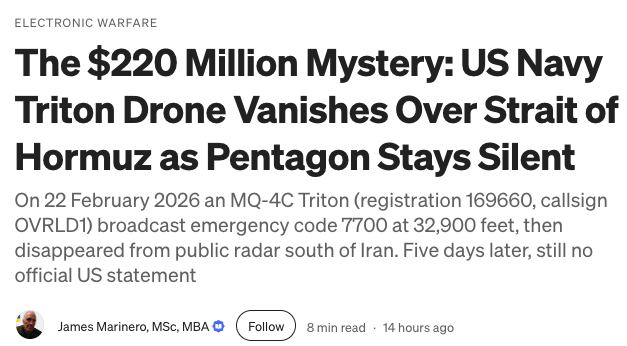 On 22 February 2026, the MQ-4C Triton, carrying registration 169660 and using the callsign OVRLD1, was conducting a routine patrol mission over the Gulf of Oman.