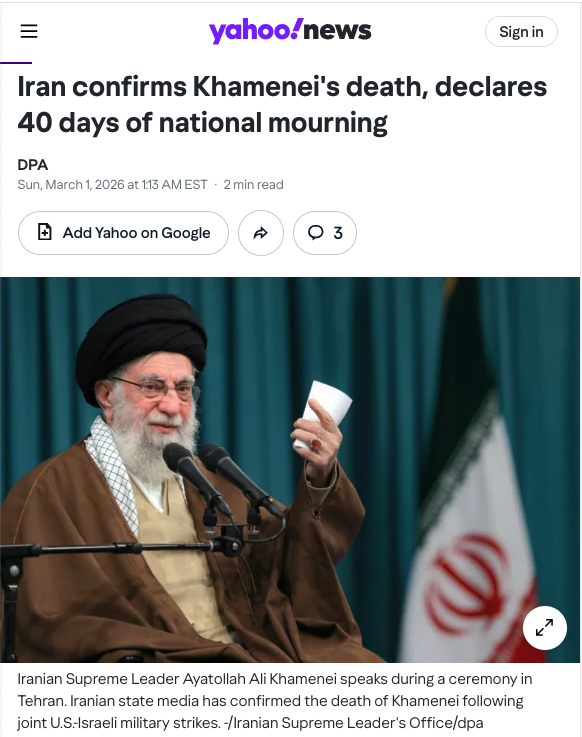 IF THIS IS TRUE…..’Iran’s Supreme Leader and more than 40 top Iranian leaders were killed in the US-Israel military operation on Saturday’…then the gates of hell have been opened in the Mideast.