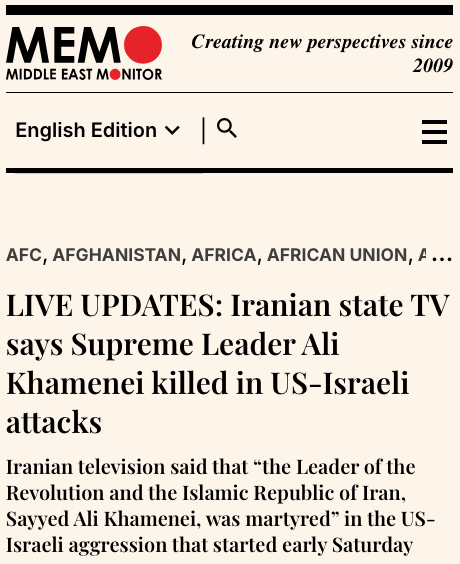 - STATE-PERPETRATED EXTRAJUDICIAL ASSASSINATION: Trump announces killing of Iran’s Supreme Leader in joint U.S.-Israel strike, urges Iranian uprising