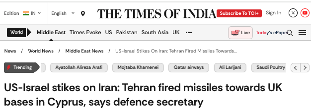 Iran fired two missiles in the direction of Cyprus, where the United Kingdom maintains military bases, Defence Secretary John Healey said, warning that the retaliation from Tehran showed signs of being indiscriminate.