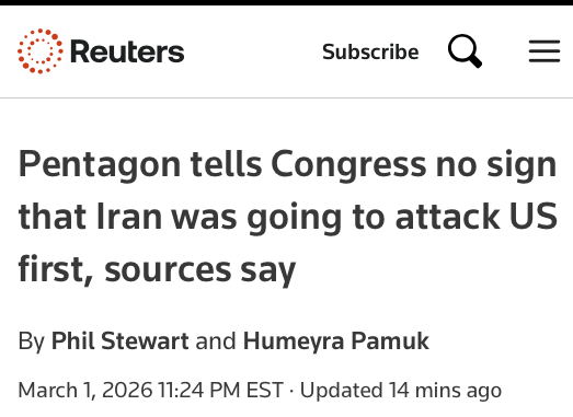 WASHINGTON, March 1 (Reuters) – Trump administration officials acknowledged in closed-door briefings with congressional staff on Sunday that there was no intelligence suggesting Iran planned to attack U.S. forces first, two people familiar with the matter said.