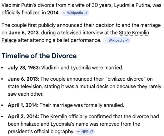 KEY POINT: Vladimir Putin and his wife were officially divorced on April 4, 2014. It’s very common for spouses to get divorced for obvious reasons after a doppelgänger replaces the original VIP. As follows: