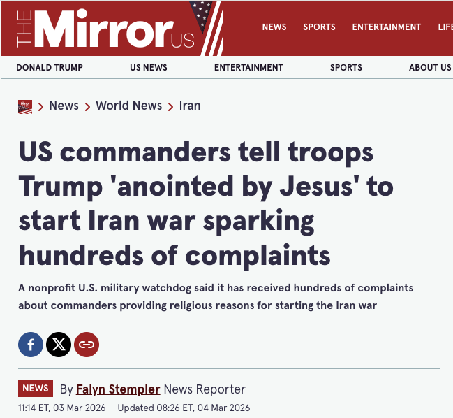 However, a fresh report found that hundreds of U.S. troops across dozens of units and installations have submitted complaints to the non-profit watchdog, the Military Religious Freedom Foundation (MRFF), since the attack about combat unit commanders providing Christian reasoning for the war, during which at least four U.S. troops have already been killed, independent journalist Jonathan Larsen reports on Substack.