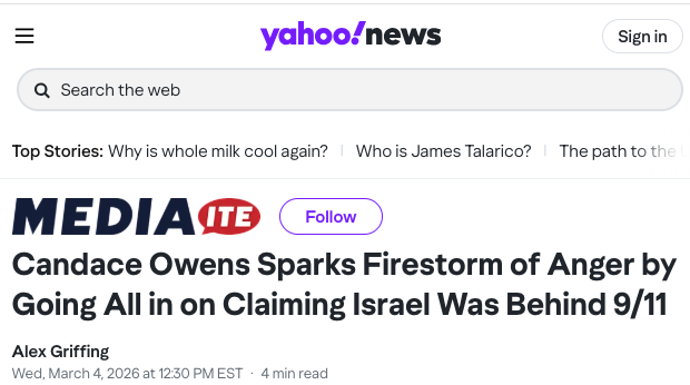 Candace Owens kicked up yet another firestorm of anger this week when she went all in on pushing the conspiracy theory that Israel was behind the terrorist attacks that killed some 3,000 Americans on September 11, 2001.