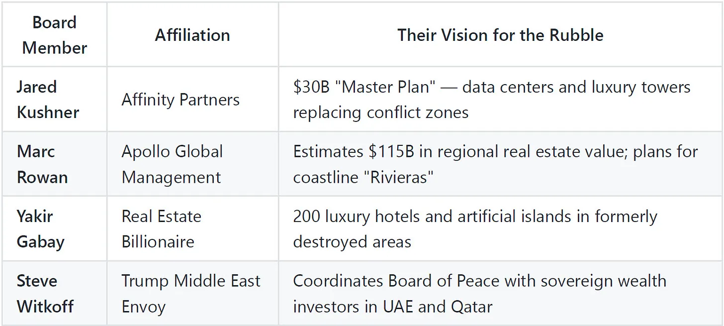 Now apply this model to Iran. As American bombs destroy Iranian infrastructure, Kushner and the Board of Peace are already shopping “amazing investment opportunities” in a “post-regime Iran” to sovereign wealth funds in Riyadh and Abu Dhabi. Board Of Profits indeed. Marc Rowan of Apollo Global Management estimates $115 billion in real estate development potential. Billionaire and insiderYakir Gabay is already proposing 200 luxury hotels and artificial islands — built on the rubble of what American and Israeli strikes have just flattened… With your tax dollars.