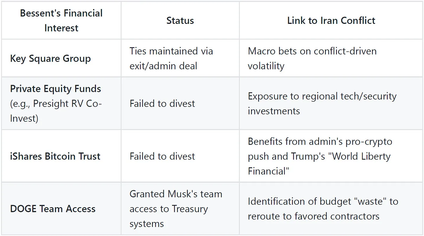 At the cabinet level: Feinberg steers Pentagon contracts toward his own investment orbit. Wright profits from energy prices driven up by the very conflict his administration created. Lutnick’s firm bets against his own tariffs and wins. Bessent sits on undivested assets while controlling the sanctions that move markets.