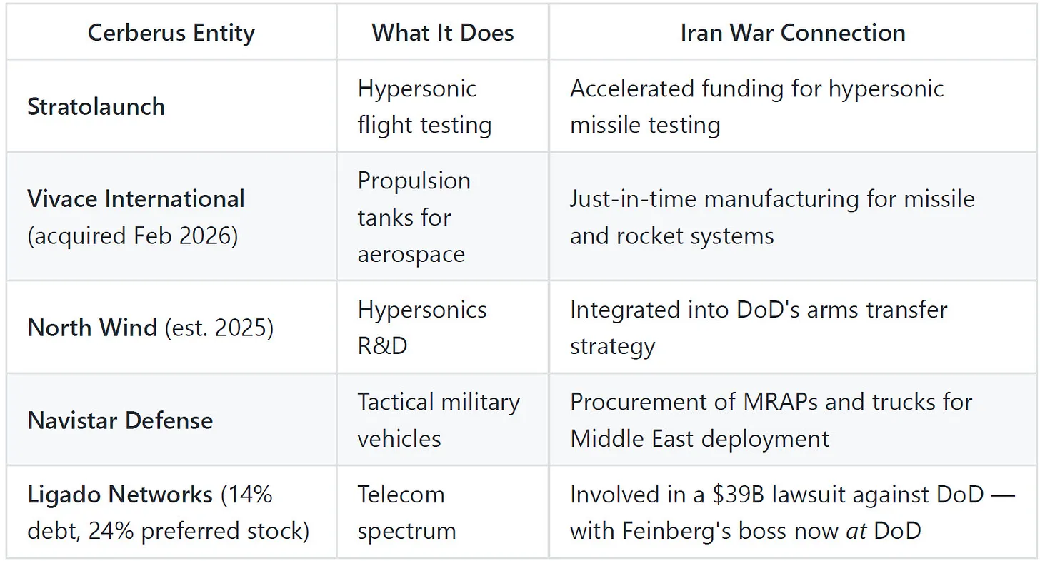 Feinberg signed an ethics agreement to divest his Cerberus interests. Then he didn’t. He maintained financial ties to the firm through administrative service contracts for accounting and tax compliance — contracts he claimed were “impossible” to transition to an outside provider. That’s a convenient “impossibility” when your “former” firm’s portfolio is a direct beneficiary of the war you’re helping run.