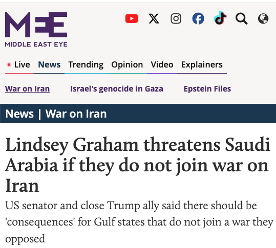 US Senator Lindsey Graham lambasted Saudi Arabia on Monday for not attacking Iran and threatened “consequences” against other Gulf countries if they do not join the US-Israeli war on Iran, which the kingdom has opposed from the outset.