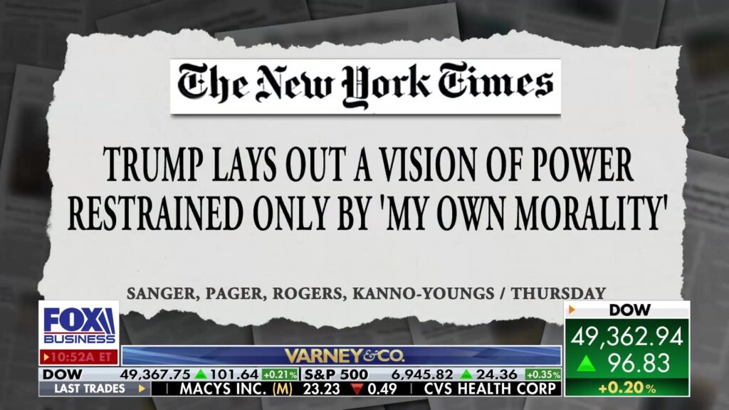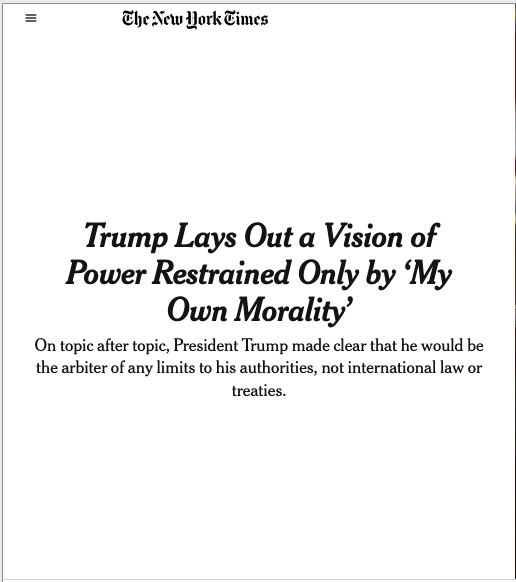 N.B. What follows is the NYT interview in which “Trump Lays Out a Vision of Power Restrained Only by ‘My Own Morality'”. Yeah, yeah, yeah, The New York Times cannot be trusted, which is totally true. Then listen to Trump’s own speech on the matter here: FLASHBACK: ‘I Don’t Need International Law’: Trump Says Power Constrained Only By ‘my Own Morality’ (Video).