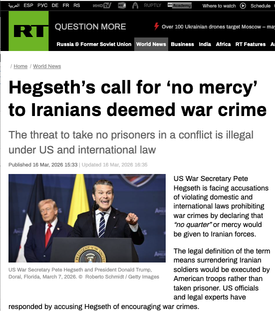 US War Secretary Pete Hegseth is facing accusations of violating domestic and international laws prohibiting war crimes by declaring that “no quarter” or mercy would be given to Iranian forces.