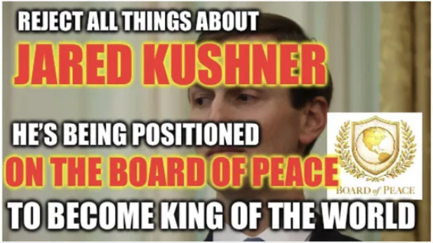 Trump has been pushing his son-in-law on us since term one. WtPeeps rejected him and his handler Netanyahu – squarely and firmly. We don’t want some pretty-faced boy-man under Mossad control anywhere near the Oval Office. So what did Trump do? Created his own ‘new world order’ called ‘Board of Peace’ and made sure Netanyahu’s ‘special’ boy-all-grown-up-now has a key place on the board – where he will eventually become its chairman and will take over the world as head Jew in charge.