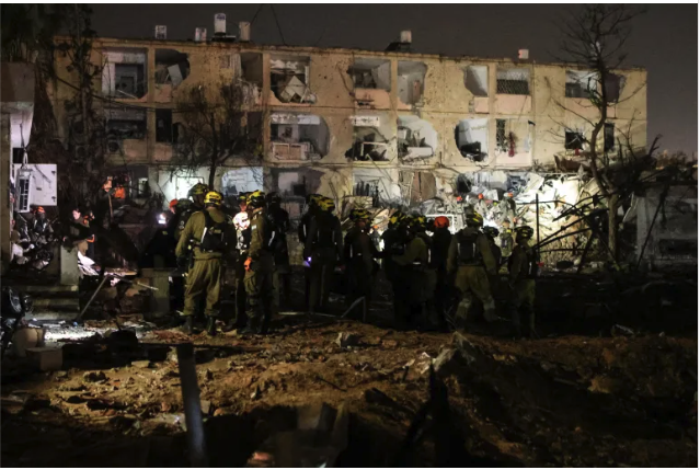 Israeli soldiers work at the scene of damage after Iranian missile barrages struck Dimona, March 21, 2026 [Ilan Assayag/Reuters]