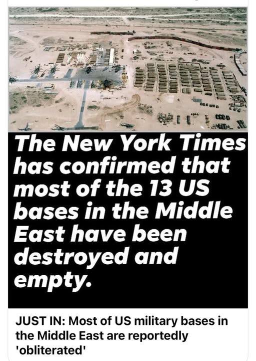 🇺🇸🇮🇷⚡️– The New York Times reports that Iran has largely succeeded in destroying 13 U.S. military bases in the Middle East.