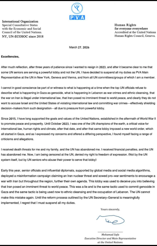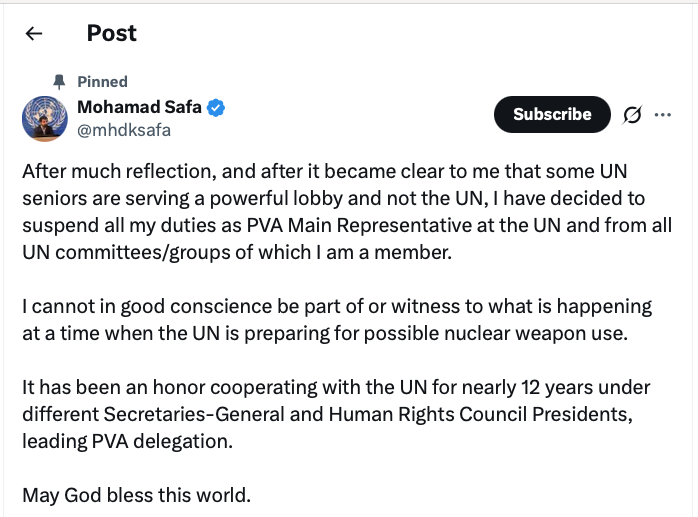 Next, see the X post by Mohamad Safa, the Executive Director and Main Representative at the United Nations in New York City for the “PVA” a designated “Special Consultative Group” handling Human Rights issues.