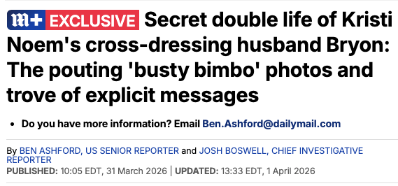 Wow. This is disturbing. Kristi Noem’s husband has been caught by @DailyMail sending pics where he crossdresses with giant fake breasts.