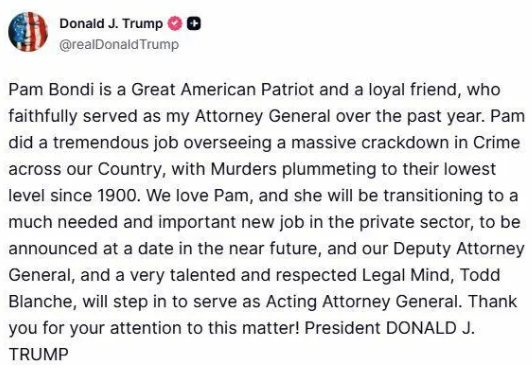 In a Thursday statement, Trump called Bondi “a Great American Patriot and a loyal friend, who faithfully served as my Attorney General over the past year,” adding “she will be transitioning to a much needed and important new job in the private sector, to be announced at a date in the near future, and our Deputy Attorney General, and a very talented and respected Legal Mind, Todd Blanche, will step in to serve as Acting Attorney General.”