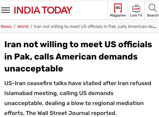 Iran has told mediators it is unwilling to meet US officials in Islamabad in the coming days and considers Washington’s demands unacceptable, the Journal reported. “Iran has officially told mediators that it is unwilling to meet US officials in Islamabad and that US demands are unacceptable,” according to the report.