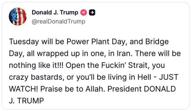 “Not in the 250 years of American history has a POTUS ever publicly threatened to commit such egregious war crimes against a sovereign nation while perpetrating them in real time.”