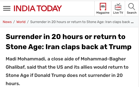 .”The true state of affairs is this: it is Trump who has about 20 hours to either surrender to Iran or his allies will return to the Stone Age. We will not back down,” he wrote on X, clapping back the original remarks made by Trump a few days ago.
