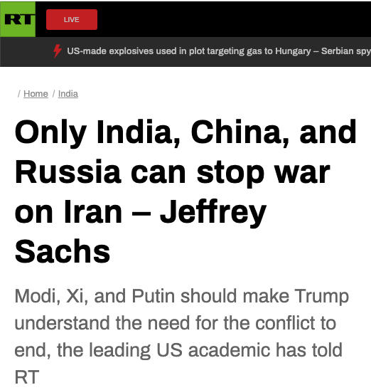 India, Russia, and China are the only powers that can combine to stop the US-Israeli war on Iran, leading American academic Prof. Jeffrey Sachs has said.