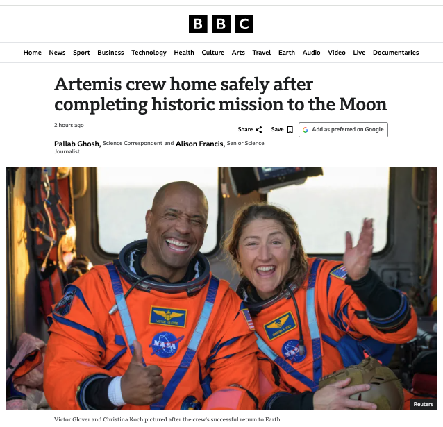 - Artemis crew home safely after completing historic mission to the Moon BUT LOOK AT THE MSM PIC BEING FEATURED