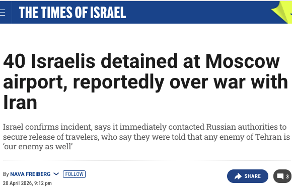 BATTLEFORWORLD.COM | April 21, 2026: The signal from Russia yesterday morning has sent Israel a message that is impossible to misread. 40 Israeli citizens stepping off a Tel Aviv flight at Moscow’s Domodedovo Airport were pulled aside by Russia’s security service, and held for five hours, where they were questioned about their links to Israel’s war on Iran, and were told point-blank that: Iran is our ally – and that its enemies are ours too.