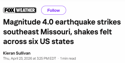COOTER, Missouri – A magnitude 4.0 earthquake struck southeastern Missouri, with shaking reported across multiple states in the Midwest and Southeast, according to the U.S. Geological Survey.