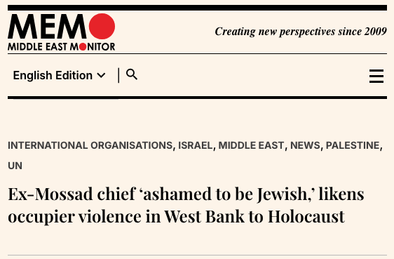 Former Mossad chief Tamir Pardo sharply criticized Israeli actions in the occupied West Bank, likening recent assaults by the occupiers to the Holocaust, saying he felt “ashamed to be Jewish,” Anadolu reports.