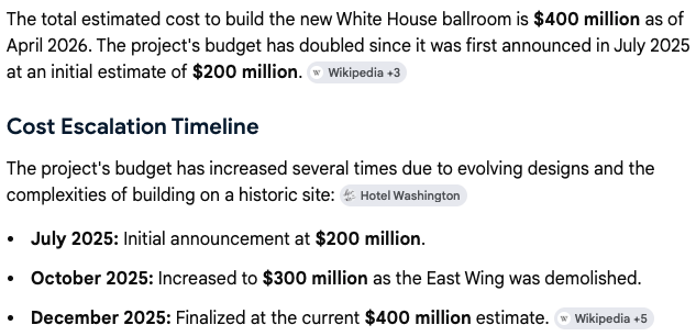 That’s right: the total cost is easily heading upwards of well over a billion dollars for Trump’s ballroom pet project as these ridiculously expensive boondoggles always do by highly purposeful design (in reality massive cost overruns are always brazen theft of taxpayers monies).