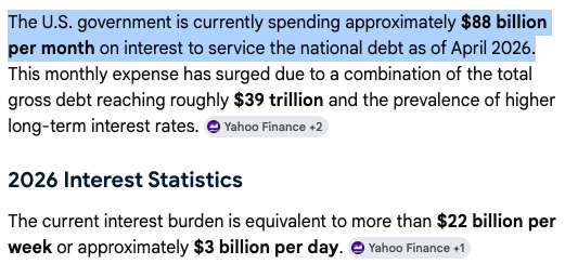 So Trump is building building a ballroom for a billion dollars while fighting a munitions-devouring war with Iran that has thus far cost $25 billion (really $50 billion), as the Treasury pays $88 billion interest per month. And that $88BIL will only quickly escalate as it has over the past few years.