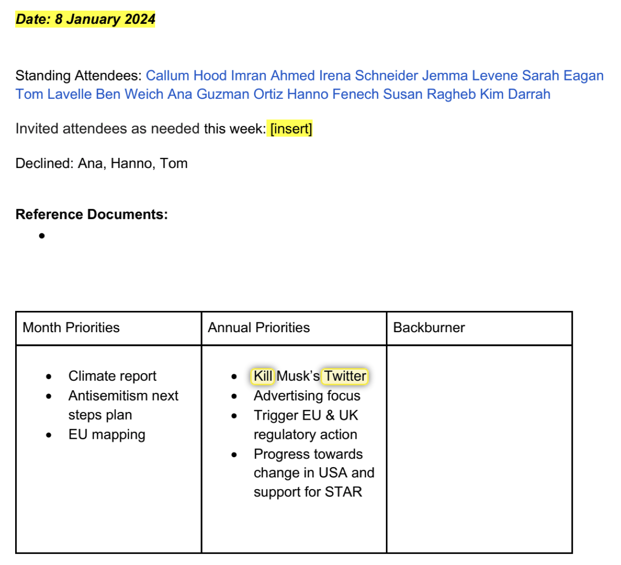 The leaked document also contained the phrase “KILL MUSK’S TWITTER,” part of CCDH’s broader strategy to bring down the social media platform following Elon Musk’s acquisition of Twitter. This violent directive has raised significant alarm, as CCDH is an organization that supposedly stands against hate, yet it is now employing aggressive and harmful language in its internal communications. How can an organization created to counter hate justify using such violent rhetoric?