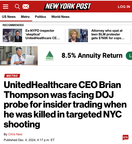 ___ https://nypost.com/2024/12/04/us-news/slain-unitedhealth-ceo-brian-thompson-was-facing-doj-probe-for-insider-trading-report/