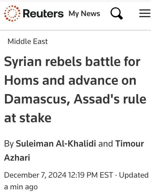 AMMAN/BEIRUT, Dec 7 (Reuters) – Syrian rebels battled government forces for control of the key city of Homs on Saturday and advanced towards the capital Damascus as front lines collapsed across the country, throwing President Bashar al-Assad’s 24-year rule into the balance.