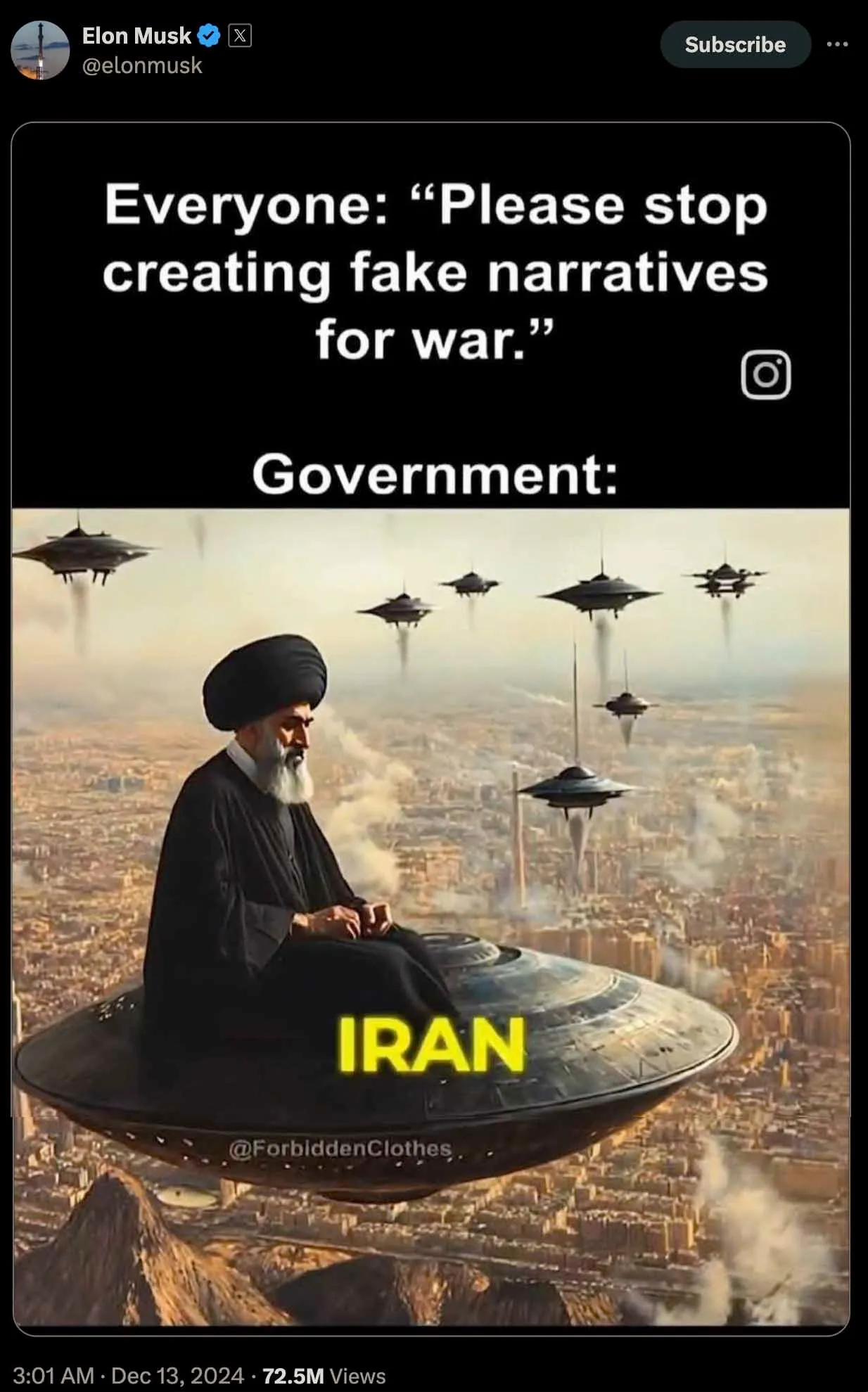 As the government’s corporate welfare king and Space-X CEO (a company that appropriates circa 1990’s NASA tech as funded via taxpayer theft), PSYOP-MUSK should have some exceptional insights into this current normalization of the upcoming “alien” invasion; but, instead, he is far too busy working his real day job of incessantly posting on “his” social media platform.