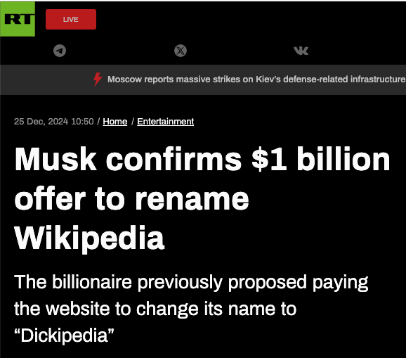 In October, while posting a photo of Wikipedia’s donation plea, Musk wrote: “I will give them a billion dollars if they change their name to Dickipedia,” and called it “a stiff & firm offer.”